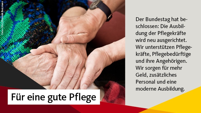 Mehr Geld, zusätzliches Personal und eine moderne Ausbildung – die CDU hat die Pflege seit 2013 in drei Reformschritten besser gemacht. Von den Verbesserungen profitieren Pflegebedürftige durch mehr Zuwendung. Angehörige bekommen höhere Zuschüsse und zusätzliche Hilfen. Pflegekräfte erhalten Unterstützung im Pflegealltag. Jetzt hat der Bundestag eine weitere wichtige Reform beschlossen: Die Ausbildung der Pflegekräfte wird neu ausgerichtet.