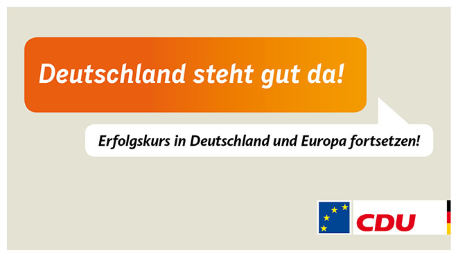 Unter Führung der Union mit Angela Merkel an der Spitze ist Deutschland zum Wachstumsmotor und Stabilitätsanker in Europa geworden. Dieser Erfolgskurs wird in der Großen Koalition fortgesetzt. Denn unser Ziel ist es, dass es den Menschen 2017 noch besser geht als heute.